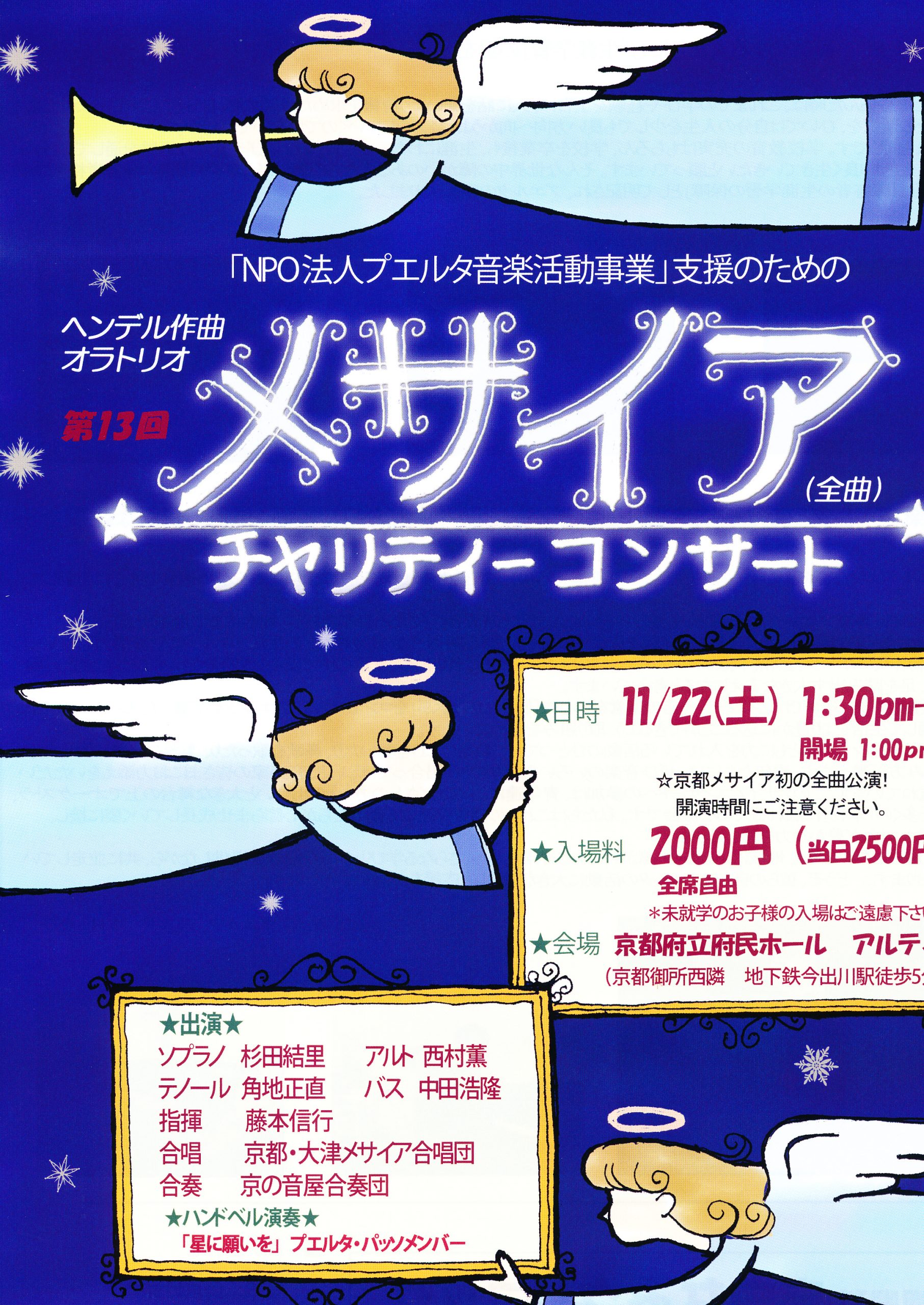 第13回メサイヤチャリティコンサート 2025年11月17日 最終更新日時 : 2025年11月17日 admin@okeankyoto このコンサートは、障害を持つ方の支援施設プエルタの活動を支援するためのチャリティコンサートで、今回が13回目ですプエルタのメンバーによるハンドベル演奏もあります毎回、彼らの演奏には感動しますお時間がございましたら是非、京都府民ホールアルティまでお越しください